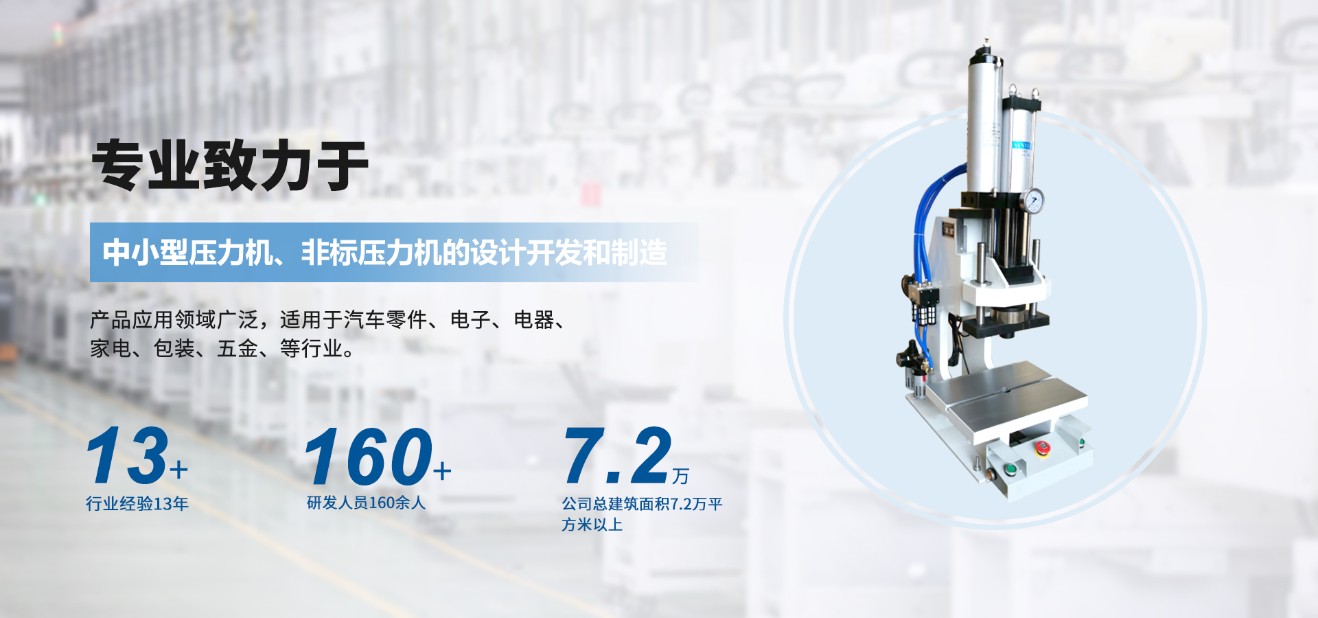 煙臺壟鑫沖壓設備有限公司是集經營、生產、技術開發為一體的經濟實體,專業致力于中小型壓力機、非標壓力機的設計開發和制造。在引進德國、日本等國家先進的鉚壓控制技術及機器設計理念的基礎上,結合相關行業的實際需要,開發出各種臺式、落地式氣動壓力機、手動壓力機、氣液增壓機、氣液增力缸、旋鉚機、無鉚釘鉚接機等鉚接設備。產品應用領域廣泛,適用于汽車零件、電子、電器、家電、包裝、五金、等行業。公司視質量為生命,并一貫遵循對每一臺產品負責,對每一位用戶負責,真誠為您服務。 自公司成立以來,秉承“誠信,創新,專業”的經營理念,以優質的產品,完善的售后服務,樹立良好的品牌形象,服務于廣大新老顧客。我們竭誠于各位同仁攜手并進,共謀發展。